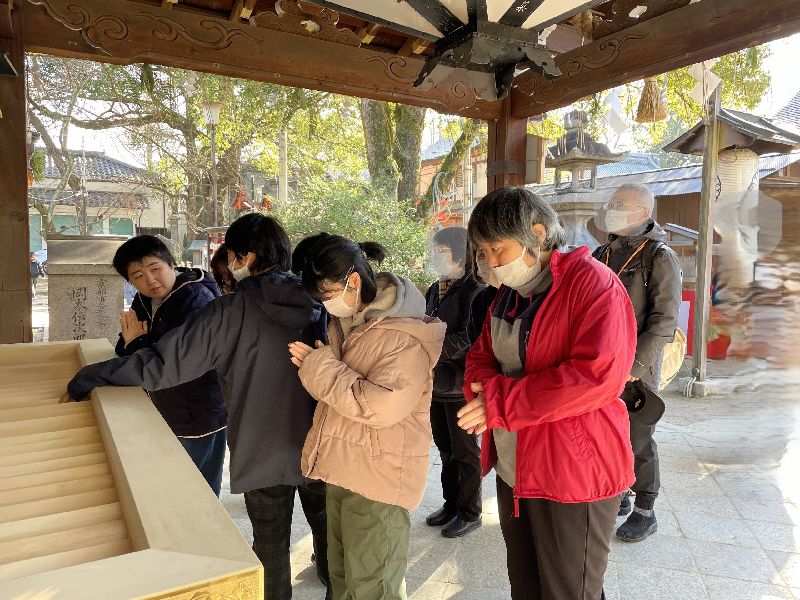 新年初の行事として、各班で近隣の神社へ「初詣」に出かけました。 凛とした空気の中、皆様真剣な表情でお参りをされ、「今年も元気に過ごせますように」と、そっと手を合わせていらっしゃいました。その姿に、私たちスタッフも身が引き締まる思いでした。